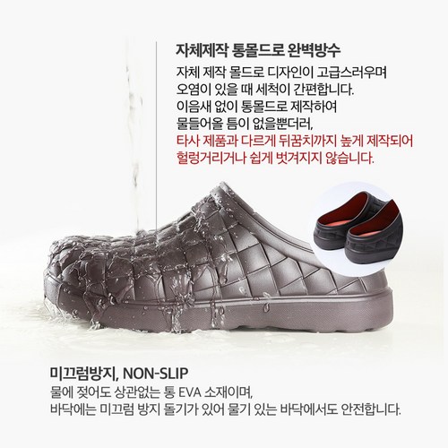 막상 써보니 초반엔 깔창이 딱딱하고 발이 불편할까 봐 걱정했는데, 몇 번 신으니 발에 맞게 자리 잡더라고요. 물 튀김도 문제없고 방수도 어느 정도 괜찮아서 주방에서 쓰기 적합합니다. 다만 미끄럼 방지는 조금 더 강화되면 좋겠습니다.
