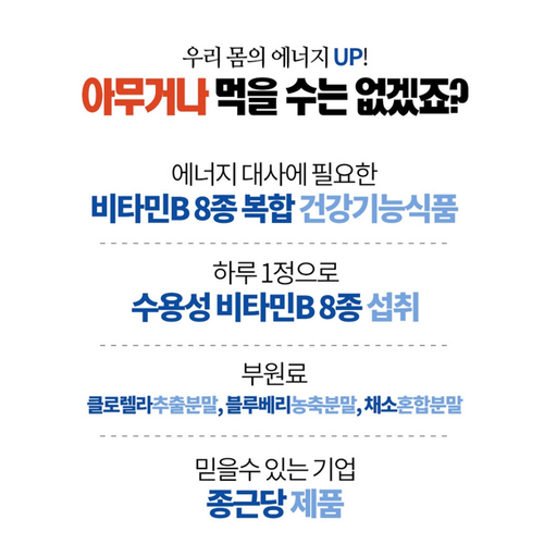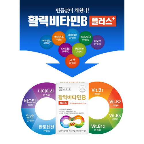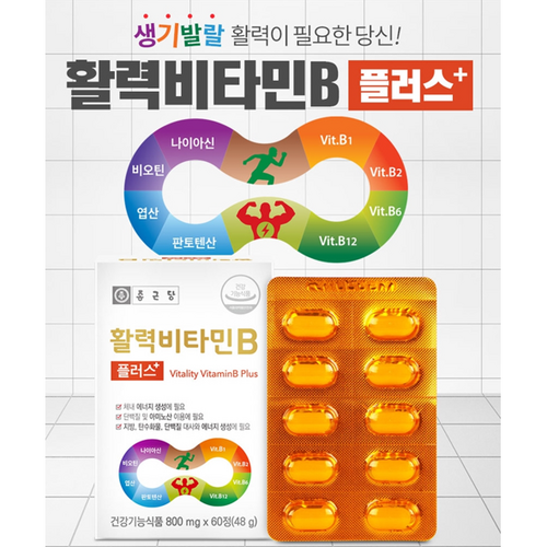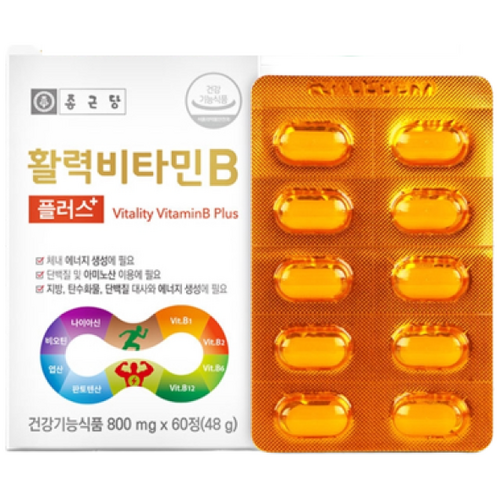 활력비타민B 피로회복 고함량 비타민B군 기능성영양제 1일1정 종근당, 60개는 피로와 스트레스를 효과적으로 관리하여 활력을 증진시켜주는 건강식품입니다. 비타민B군의 최적의 조화로 설계된 이 제품은 하루 한 정으로 간편하게 섭취할 수 있어 바쁜 일상을 사는 현대인에게 적합합니다.