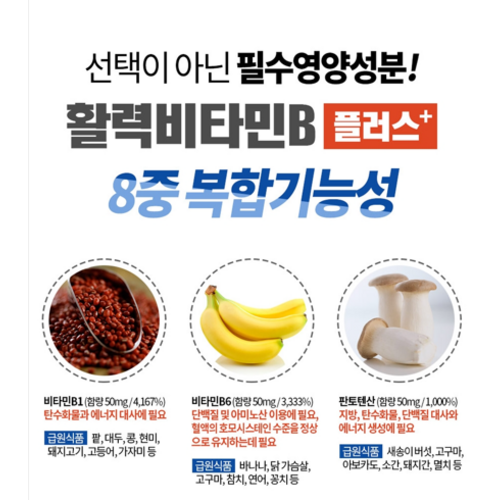 피로회복에 특화된 이 영양제는 에너지 대사를 촉진하여 체내 에너지를 증가시키고, 정신적인 피로를 덜어주며 귀찮고 지친 일상에서 활력을 찾아줄 것입니다. 특히, 비타민B1, B2, B6, B12 등의 필수 비타민이 포함되어 있어 종합적인 피로 회복과 건강 증진에 도움을 줍니다.